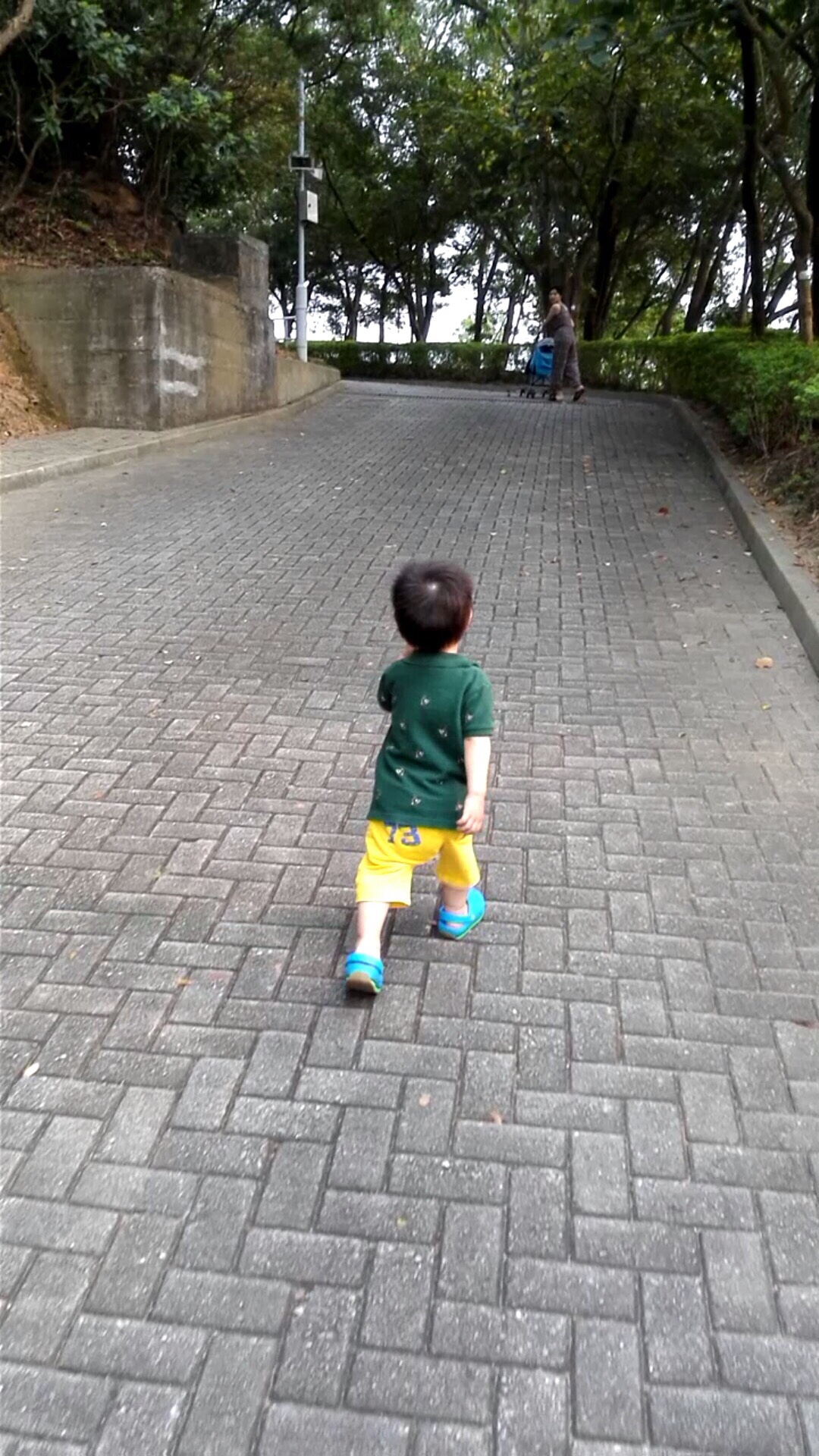 貓貓再見。在水泥地上慢慢走,不要跑。一回頭就又看見爸爸了。