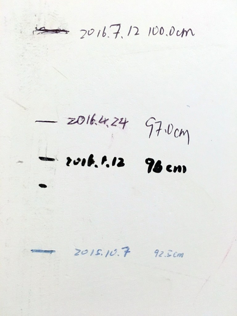 剛好一米。我讓貓貓靠牆站好,他說,“爸爸為什麼我要罰站?” 我說不是罰站爸爸給你量一下就好。他說,“爸爸給我量體溫。”