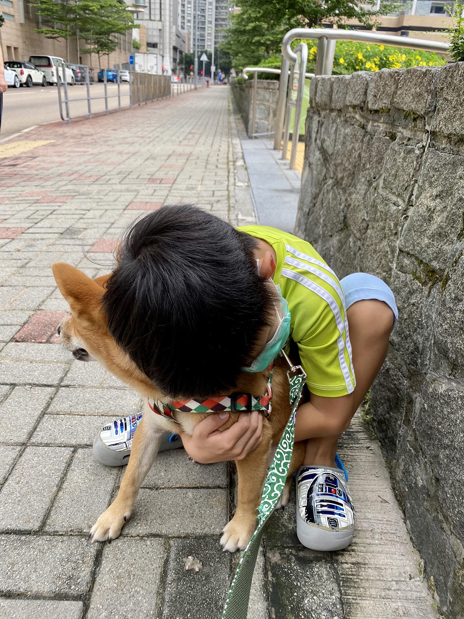 On his second walk Argos is still very much trying to take everything in and adapt to the environment. He’s particularly scared of the two-deck buses, tenses up and assumes the attacking position if one swoops by too closely. Whenever Maomao feels Argos trembling through the leash, he will stoop down and hold him, press his cheek on Argo’s head and pat him on the leg until he stops shaking. Then he will stand up and resume walking like nothing happened.